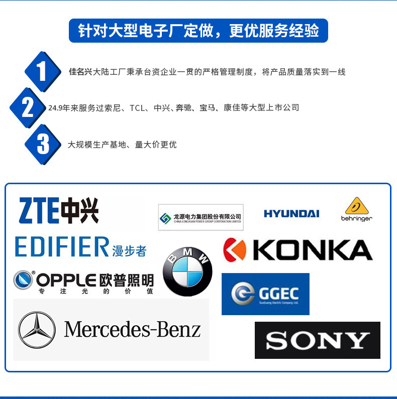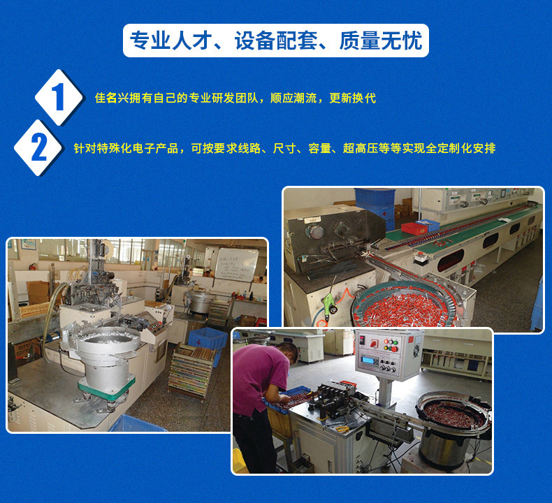 2017年12月28日正式更名為深圳佳名興電容有限公司 佳名興JMX廣東省惠州市電容器工廠占地面積13149平米,廠房面積8227平方米,每年生產(chǎn)的超級電容(單體、模組、方案定制)薄膜類電容(包括:金屬化薄膜電容、軸向薄膜電容,工業(yè)級電源用薄膜電容、長壽命薄膜電容、等)軸向鋁電解電容、電力電容器、雙面金屬化薄膜電容等被動元器件達8-13億只 佳名興JMX電容器60%-70%以上產(chǎn)品出口歐美,印度,東南亞等世界各地,30%-40%銷往中國大陸,產(chǎn)品規(guī)格齊全,體積小,可靠性優(yōu)良,穩(wěn)定性好,價格合理 佳名興JMX電容器被廣泛用于:汽車音響,車載分音器,音響分頻器,專業(yè)音響功放,衛(wèi)星通訊設(shè)備,LED驅(qū)動電源,LED節(jié)能燈,開關(guān)電源及電腦周邊產(chǎn)品等各個電子行業(yè)