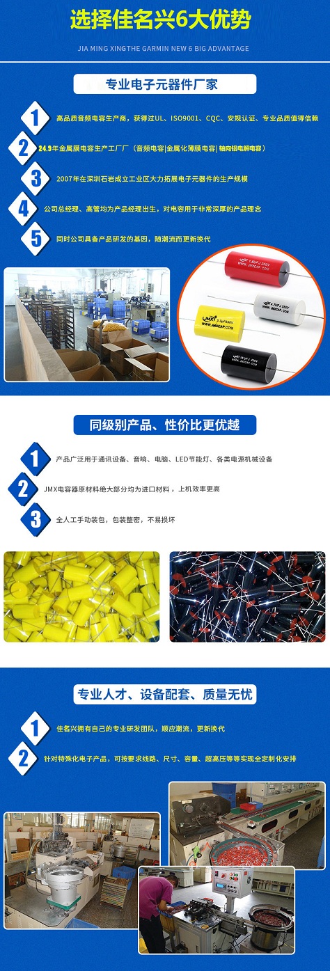 JMX牌電容已為上千家客戶提供優(yōu)質(zhì)高端電容近20年, JMX牌電容已經(jīng)成為中國(guó)最優(yōu)質(zhì)誠(chéng)信的電容供應(yīng)商之一,熱誠(chéng)歡迎各界朋友蒞臨佳名興電容器工廠參觀,指導(dǎo)和業(yè)務(wù)洽談,看了以上的音頻電容選擇介紹希望能給您帶來(lái)幫助