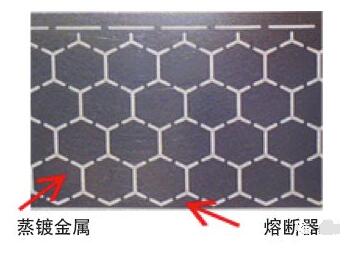 伴隨膜厚的薄膜化,需要提高耐電壓。故此,會(huì)在蒸鍍的金屬上形成圖案,而且在小段(區(qū))的紋樣上保持熔斷器(安全機(jī)構(gòu))的功能。根據(jù)要求的性能開(kāi)發(fā)蒸鍍圖案的紋樣,并且具備高耐電壓化和長(zhǎng)壽命化。