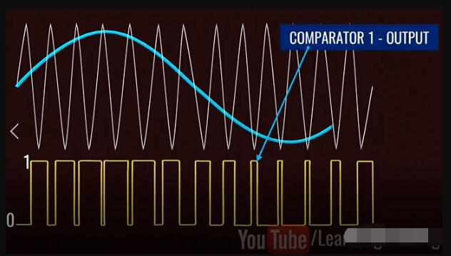 為此使用了兩個(gè)比較器。比較器將正弦波與三角波進(jìn)行比較。一個(gè)比較器使用正常的正弦波;另一個(gè)比較器使用反向正弦波。