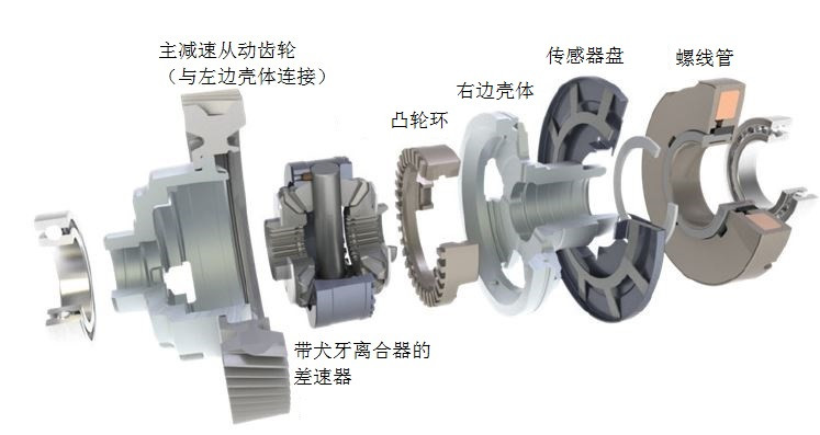 高速時,電子斷開差速器將電動機(jī)與車輪分離,以提高高速時系統(tǒng)效率并防止電動機(jī)超速。電子斷開差速器控制犬牙式離合器接合或分離,使用霍爾傳感器非接觸式測量離動合器位置。