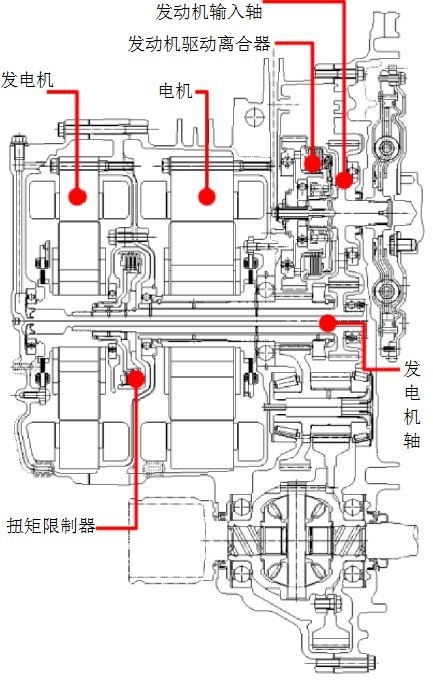 吉凱恩集成發(fā)動機(jī)電動機(jī)發(fā)電機(jī)的變速器,剖視圖如圖7所示。應(yīng)用在三菱歐藍(lán)德(Mitsubishi Outlander)混合動力汽車上。