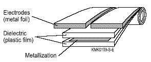 前面我們說過,現(xiàn)在使用的軸向薄膜電容器一般使用的電介質(zhì)是聚酯膜和聚丙烯膜,金屬化的塑膠薄膜按照一定的模式規(guī)則排列好(如下圖)卷繞而成,這也就是軸向薄膜電容器的主體部分。(注:Electrodes電極、Dielectric電介質(zhì)、Metallization金屬化薄膜)。