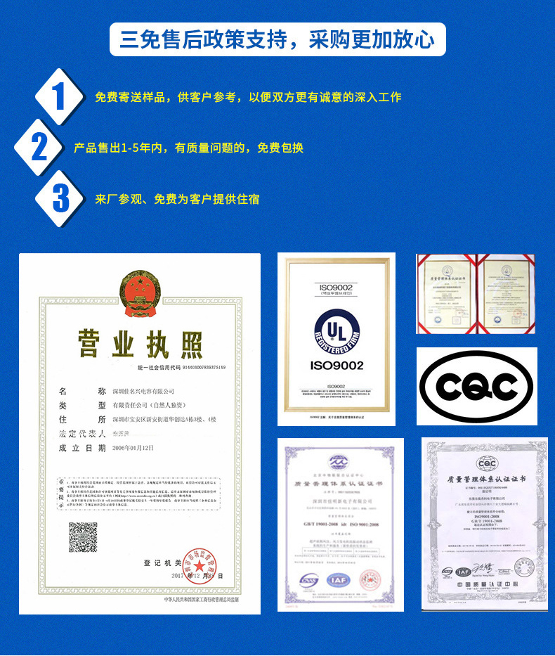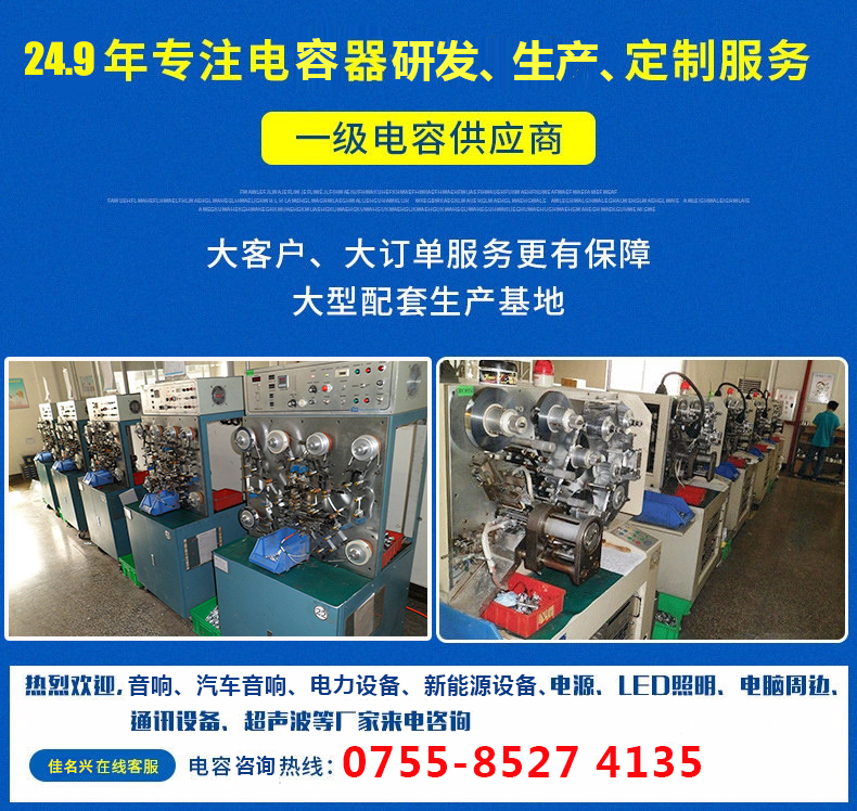 2017年12月28日正式更名為深圳佳名興電容有限公司 佳名興JMX廣東省惠州市電容器工廠占地面積13149平米,廠房面積8227平方米,每年生產(chǎn)的超級電容(單體、模組、方案定制)薄膜類電容(包括:金屬化薄膜電容、軸向薄膜電容,工業(yè)級電源用薄膜電容、長壽命薄膜電容、等)軸向鋁電解電容、電力電容器、雙面金屬化薄膜電容等被動元器件達8-13億只 佳名興JMX電容器60%-70%以上產(chǎn)品出口歐美,印度,東南亞等世界各地,30%-40%銷往中國大陸,產(chǎn)品規(guī)格齊全,體積小,可靠性優(yōu)良,穩(wěn)定性好,價格合理 佳名興JMX電容器被廣泛用于:汽車音響,車載分音器,音響分頻器,專業(yè)音響功放,衛(wèi)星通訊設備,LED驅(qū)動電源,LED節(jié)能燈,開關電源及電腦周邊產(chǎn)品等各個電子行業(yè)