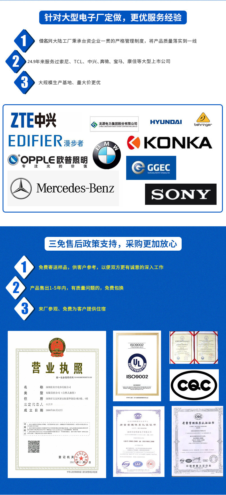 2017年12月28日正式更名為深圳佳名興電容有限公司 佳名興JMX廣東省惠州市電容器工廠(chǎng)占地面積13149平米,廠(chǎng)房面積8227平方米,每年生產(chǎn)的超級(jí)電容(單體、模組、方案定制)薄膜類(lèi)電容(包括:金屬化薄膜電容、軸向薄膜電容,工業(yè)級(jí)電源用薄膜電容、長(zhǎng)壽命薄膜電容、等)軸向鋁電解電容、電力電容器、雙面金屬化薄膜電容等被動(dòng)元器件達(dá)8-13億只 佳名興JMX電容器60%-70%以上產(chǎn)品出口歐美,印度,東南亞等世界各地,30%-40%銷(xiāo)往中國(guó)大陸,產(chǎn)品規(guī)格齊全,體積小,可靠性?xún)?yōu)良,穩(wěn)定性好,價(jià)格合理 佳名興JMX電容器被廣泛用于:汽車(chē)音響,車(chē)載分音器,音響分頻器,專(zhuān)業(yè)音響功放,衛(wèi)星通訊設(shè)備,LED驅(qū)動(dòng)電源,LED節(jié)能燈,開(kāi)關(guān)電源及電腦周邊產(chǎn)品等各個(gè)電子行業(yè)
